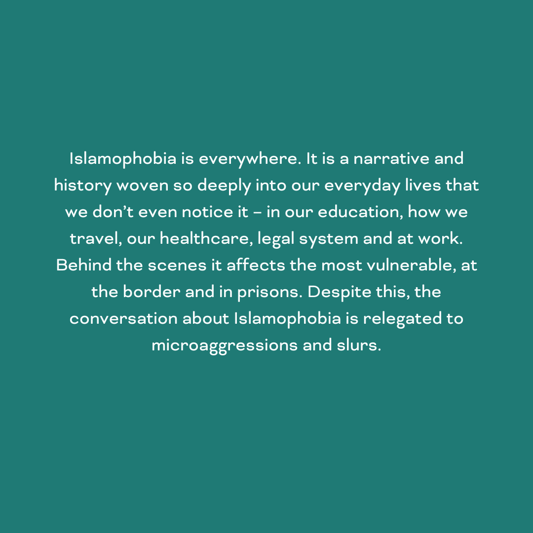 Islamophobia is everywhere. It is a narrative and history woven so deeply into our everyday lives that we don’t even notice it – in our education, how we travel, our healthcare, legal system and at work. Behind the scenes it affects the most vulnerable, at the border and in prisons. Despite this, the conversation about Islamophobia is relegated to microaggressions and slurs.