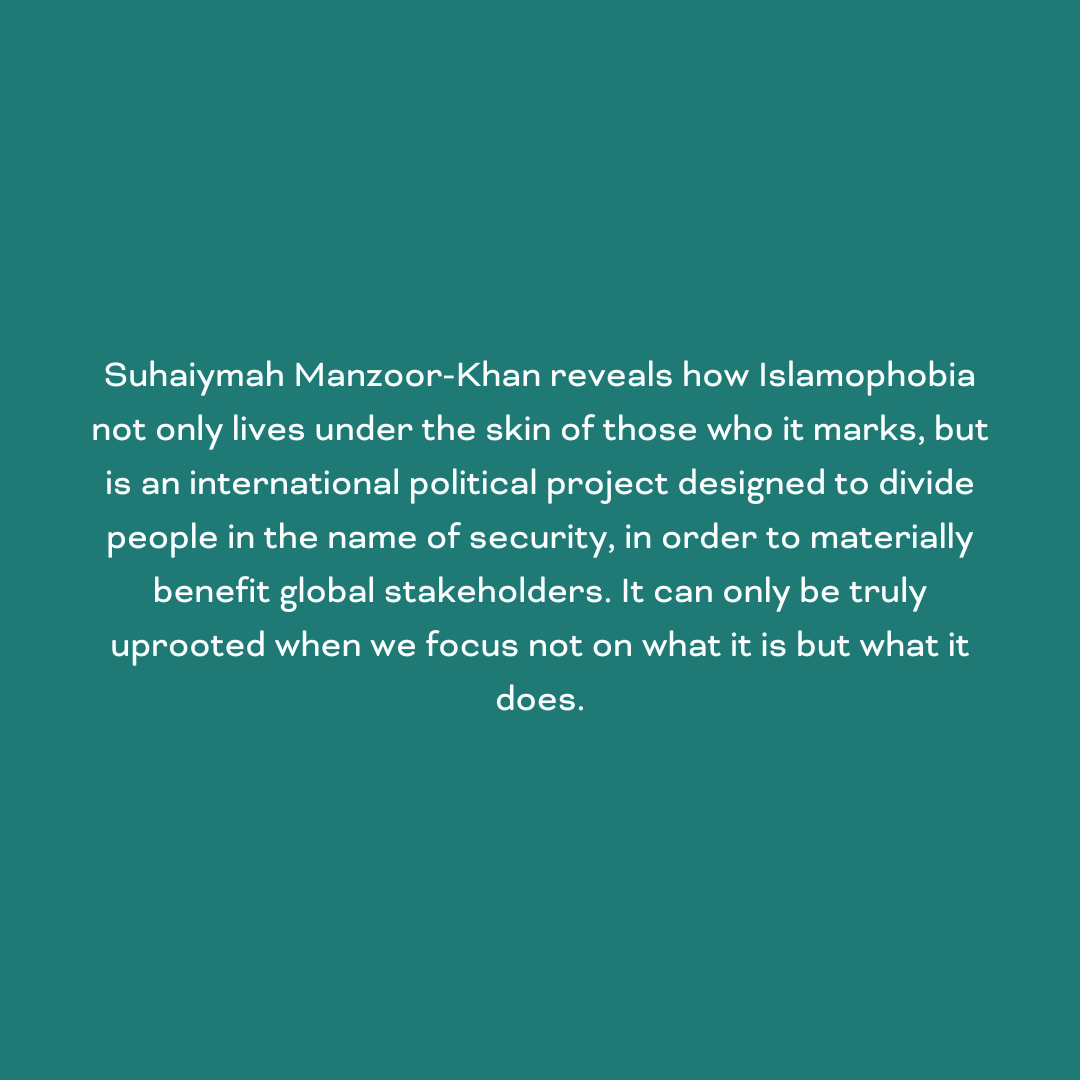 Suhaiymah Manzoor-Khan reveals how Islamophobia not only lives under the skin of those who it marks, but is an international political project designed to divide people in the name of security, in order to materially benefit global stakeholders. It can only be truly uprooted when we focus not on what it is but what it does.